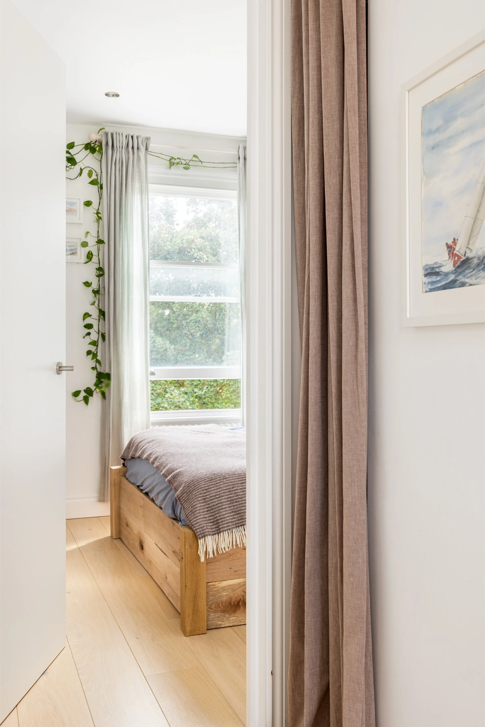 With limited space, the design team focused on amplifying the flat's unique charm: generous ceiling height, grand timber sash windows, and enchanting sunlight cast through the flat at dawn and dusk.